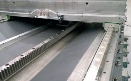 4. 立柱通過齒輪齒條在X軸床身上移動, 使用大型線軌和滑座,由兩個伺服馬達(主 – 從)配置驅(qū)動。